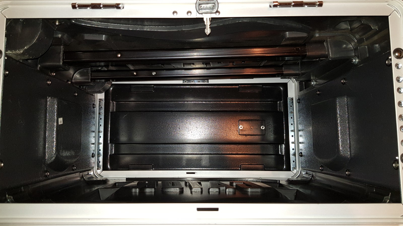 Estuche tipo Rack nuevo A ESTRENAR, de polietileno ligero con tapas y rieles frontales y traseros de acero galvanizado de 7 mm, 4U, profundidad 19″, con cerrojo en ambos lados, mango telescópico y ruedas empotradas. Profundidad del riel delantero al riel trasero: 42,54 cm. Con etiquetas y guardado en su caja, libre de polvo.