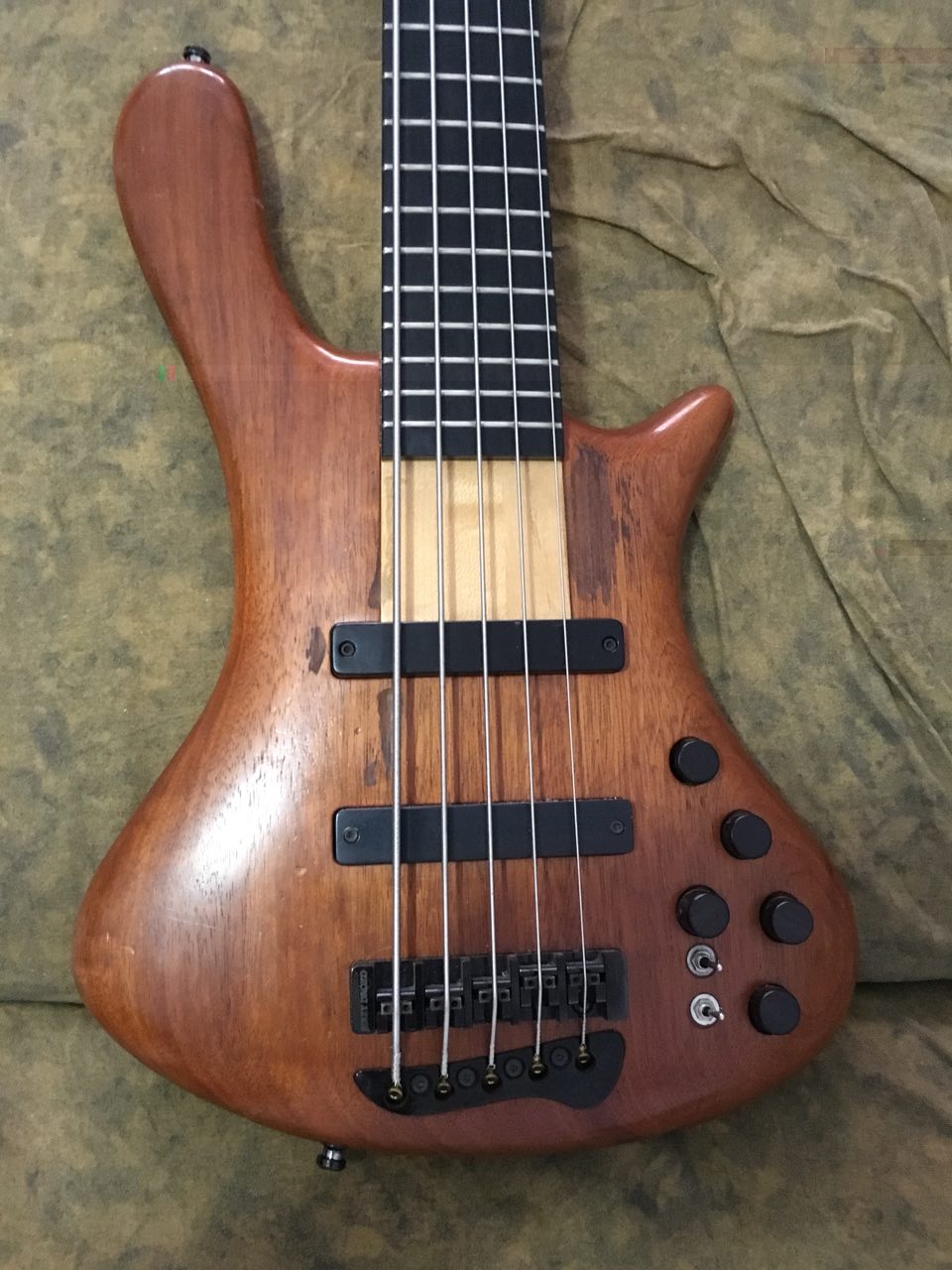 Jerzy Drozd Soul de 5 cuerdas, con pastillas Jerzy Drozd, previo Aguilar OBP-3 con volumen, graves, medios, agudos, balance, selector de freq. medias y selector activo/pasivo.